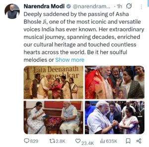 PM Narendra Modi wrote on social media “X”, “Deeply saddened by the passing of Asha Bhosle Ji, one of the most iconic and versatile voices India has ever known. Her extraordinary musical journey, spanning decades, enriched our cultural heritage and touched countless hearts across the world. Be it her soulful melodies or vibrant compositions, her voice carried timeless brilliance. I’ll always cherish the interactions I’ve had with her. My condolences to her family, admirers and music lovers. She will continue to inspire generations and her songs will forever echo in people’s lives.”